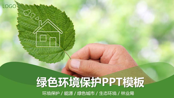 幻灯片模板封面,使用了一张手拿绿叶与白色房屋图标作为背景图片。与环境保护主题搭配。中间使用白色字体填写PowerPoint标题文字。