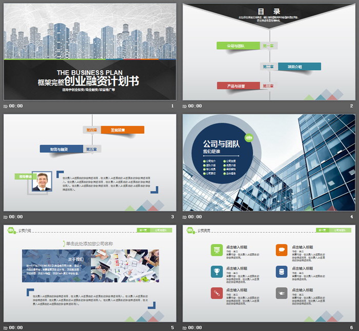 这是一套城市剪影背景的完整框架的,创业融资计划书PPT模板,共44页;