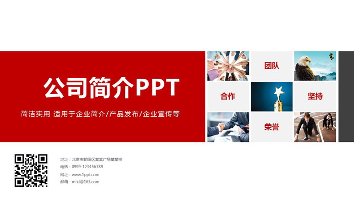 幻灯片模板封面,使用了简洁的红色形状填写公司简介PPT标题文字。右侧放置了图片与文字搭配,意在宣传:团队、合作、坚持、荣誉的企业文化。左下角放置企业二维码,以及企业联系方式等信息。