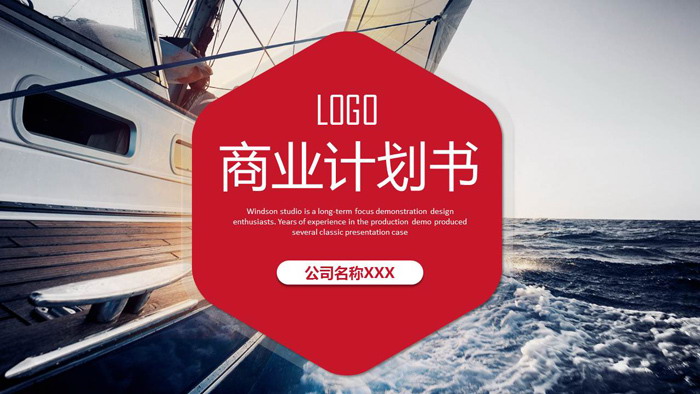 幻灯片模板封面,使用了行驶在大海上的帆船作为背景图片。中间放置红色六边形填写商业融资计划书PPT标题文字。界面以图片排版方式制作,简洁实用。