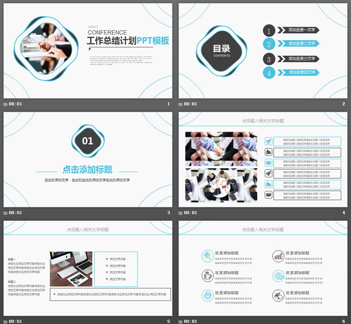 PowerPoint模板内容页,由24张蓝色灰色搭配的细线图表制作。另外使用了握手图片、会议图片、欧美职场白领图片进行排版。