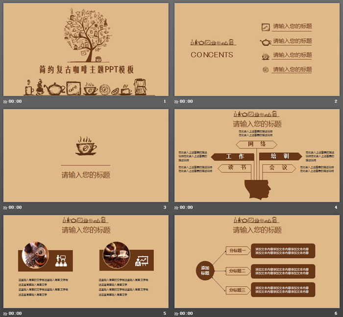 这是一套棕色复古手绘咖啡主题PPT模板,共27张;