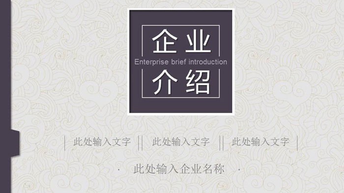 幻灯片模板使用了古典中国风花纹作为背景图片。PPT模板首页,放置了方形紫色文本框,填写企业介绍PPT标题文字。界面设计简约实用。