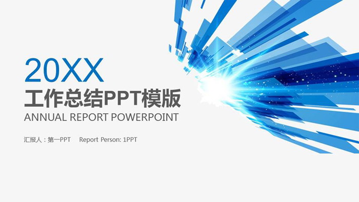 幻灯片模板封面,使用了一张带有光感的蓝色抽象图片作为背景。左侧填写工作总结PPT标题文字。界面设计简洁通用。