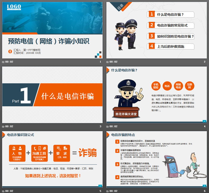 这是一套预防电信网络诈骗PPT模板,共46张;