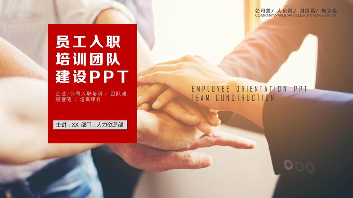 这是一套手叠手背景的,新员工入职培训团队建设PPT模板,共34张;
