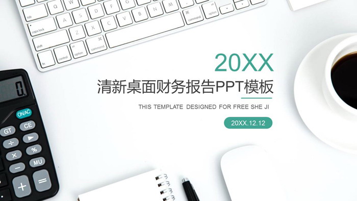 幻灯片模板封面,使用了摆放了咖啡杯、计算器、键盘、记事本的,白色色调的清新办公桌面作为背景图片。中间使用细线黑体填写财务报告PPT标题文字。