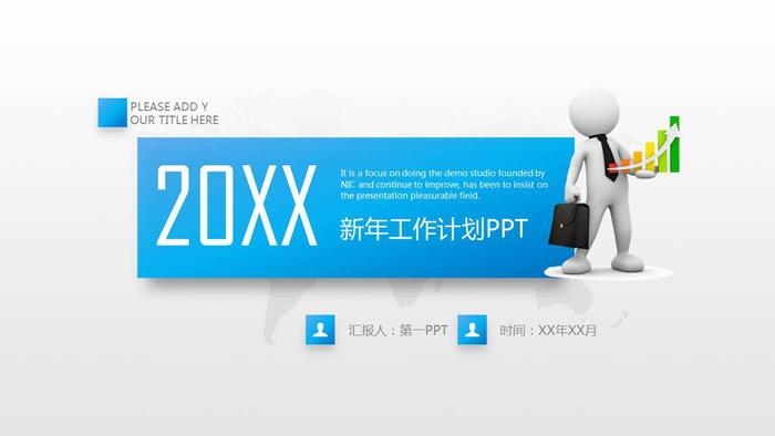幻灯片模板封面,使用了白色立体小人作为背景图片。中间使用带有阴影特效的蓝色矩形填写,新年工作计划PPT标题文字。界面设计简洁实用。