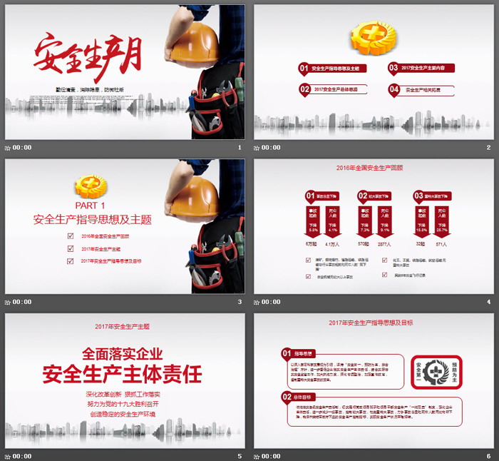 PowerPoint模板内容页,使用红色为主题色制作。放置了很多安全生产插图。