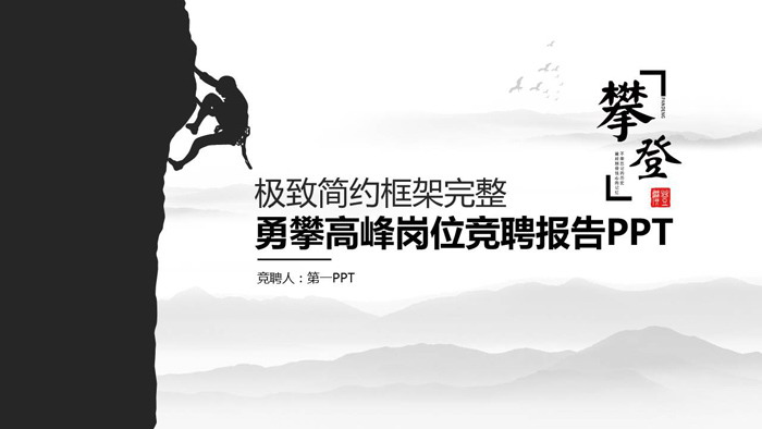 幻灯片模板首页,以为个黑色人物剪影整攀登在悬崖上,背后是群山云海。中间填写个人岗位竞聘PPT标题文字。界面设计寓意拼搏、努力、向上、进取。
