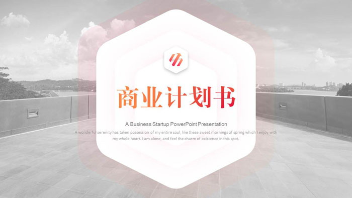 幻灯片模板封面,使用了建筑图片与圆角六边形作为背景图片。中间填写商业融资计划书PPT标题文字。界面设计时尚商务。