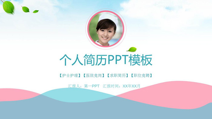 幻灯片模板封面, 使用了绿叶、蓝色粉色波纹作为背景图片。中间放置圆形的医生护士照片,在照片下方填写个人简历PPT标题。界面设计简洁清新。