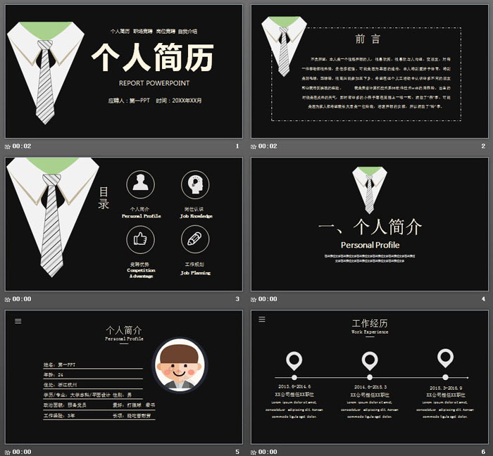 这是一套黑色西装领带图形背景的,个人求职简历PPT模板,共22张;