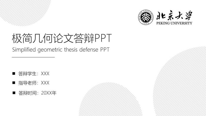 幻灯片模板使用了细线填充的圆形图案背景。右上角放置毕业学校的logo,左侧填写毕业答辩PPT标题文字,以及答辩人等信息。界面设计非常简洁。