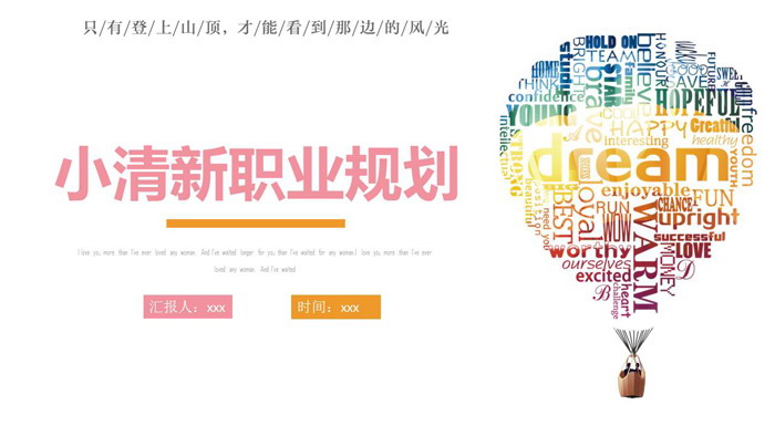 幻灯片模板封面,使用了一个由各种励志单词组合的,热气球图案作为背景图片。左侧使用淡雅粉色填写 职业规划书PPT标题文字。界面风格清新淡雅。