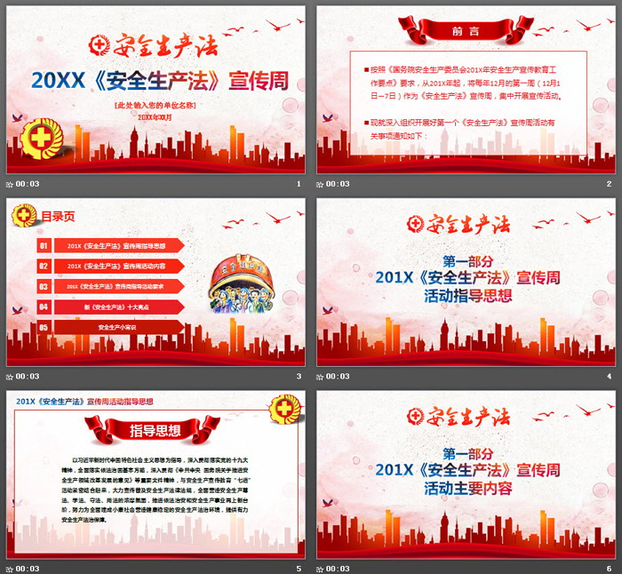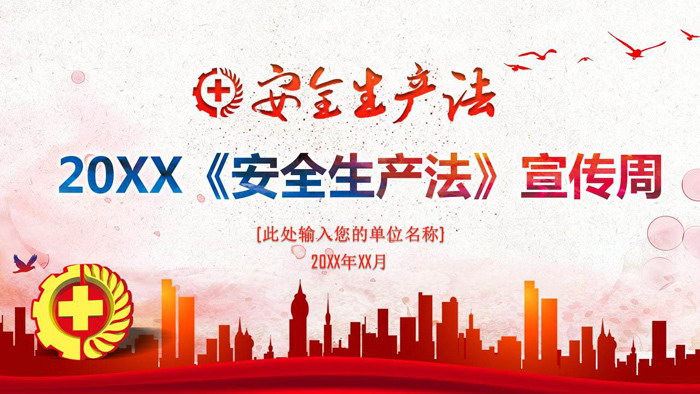 幻灯片模板使用了醒目的红色系设计制作。PPT模板封面,使用城市剪影、安全生产徽章作为背景。中间填写《安全生产法》宣传周PPT标题。