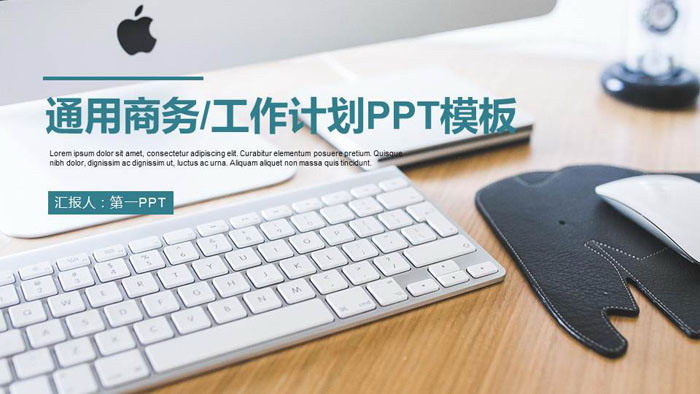 幻灯片模板封面,使用了一张摆放苹果电脑与鼠标键盘的办公桌面PPT背景图。左侧填写新年工作计划PPT标题,与说明文字。界面设计简洁干净。