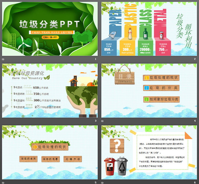 这是一套绿色清新风格的,垃圾分类PPT模板,共28张;