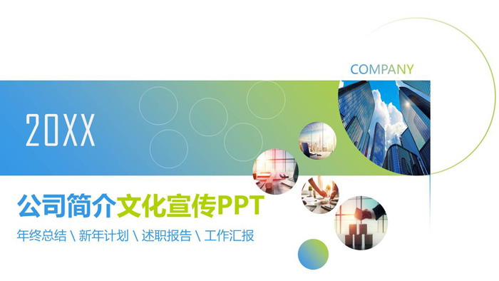 幻灯片模板封面,使用了蓝绿渐变色条填写,公司简介企业宣传PPT标题文字。右侧放置多张散列的圆形企业图片装饰。界面设计简洁清新。