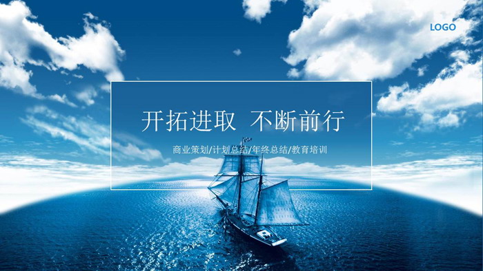 幻灯片模板封面,一张行驶在蓝天白云之下,蓝色海洋之上的帆船背景图片。中间使用白色线框填写商业计划书PPT标题文字。界面设计大气简洁,寓意启航。