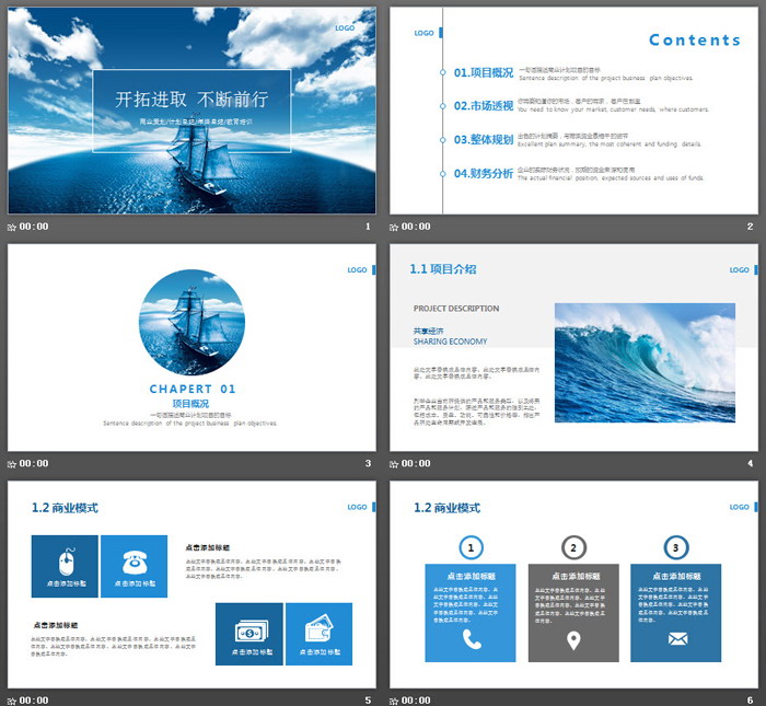 这是一套蓝天白云大海帆船背景的,商业计划书PPT模板,共25张;