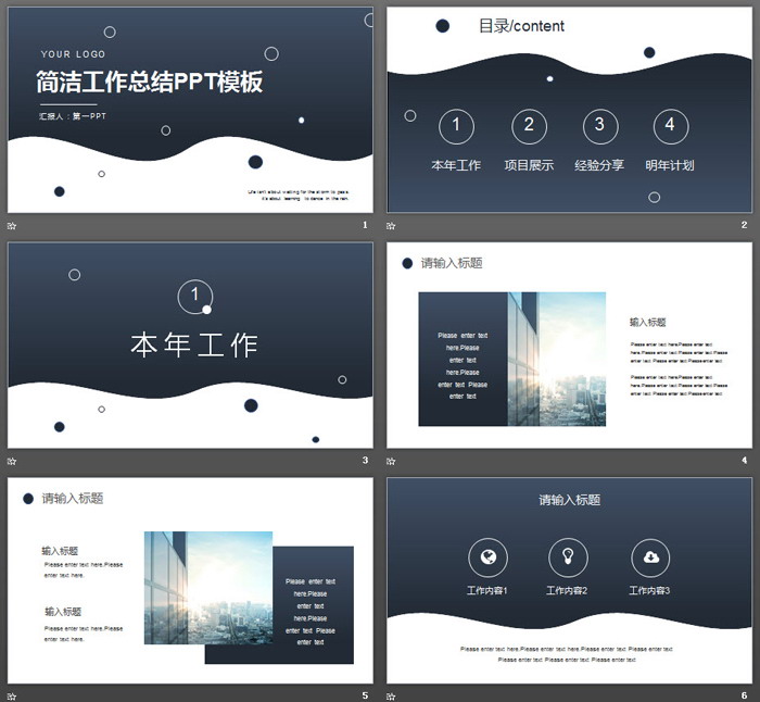 幻灯片模板使用了稳重的深蓝色作为主色调。PPT模板封面,使用了蓝色渐变、白色水波纹、白色圆圈、蓝色圆点等PPT背景元素。左侧使用白色字体填写工作总结PPT标题文字。界面设计简洁实用。