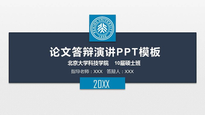 幻灯片模板封面,使用简洁的蓝色矩形填写毕业论文答辩PPT标题。上方放置毕业院校logo,下方填写答辩时间,答辩人,指导老师等。