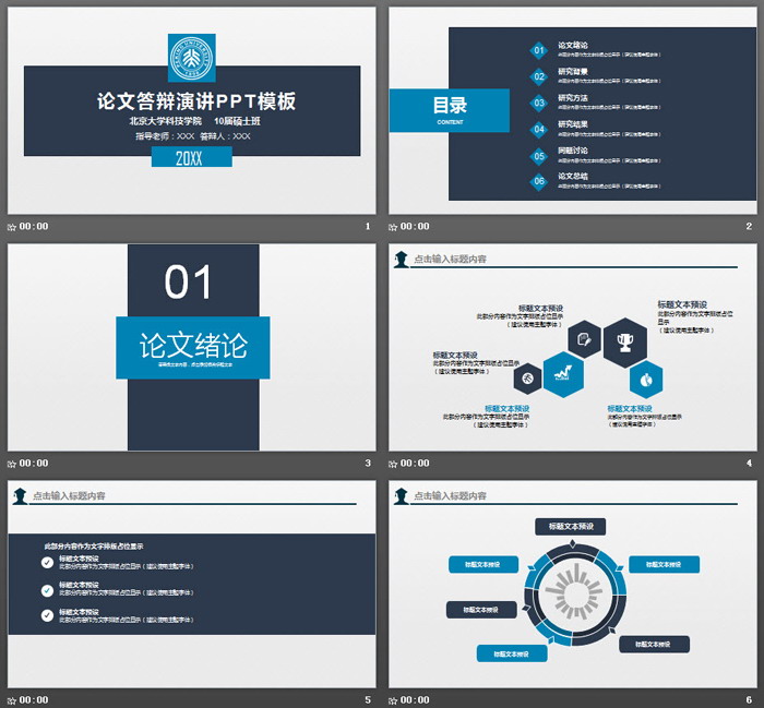 PowerPoint模板内容页,由23张深蓝色与浅蓝色搭配的扁平化幻灯片图表制作。整个模板设计风格偏向稳重风格,与学术主题搭配。