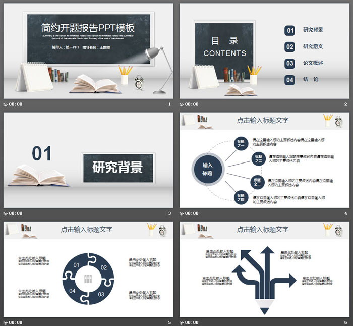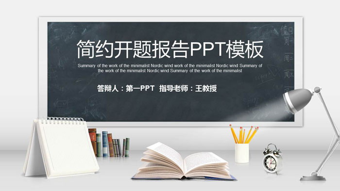 幻灯片模板封面,使用了黑板、台灯、书籍、记事本等PPT背景元素。与毕业生、毕业论文主题搭配。中间填写毕业论文开题报告PPT标题文字。界面清爽简约。