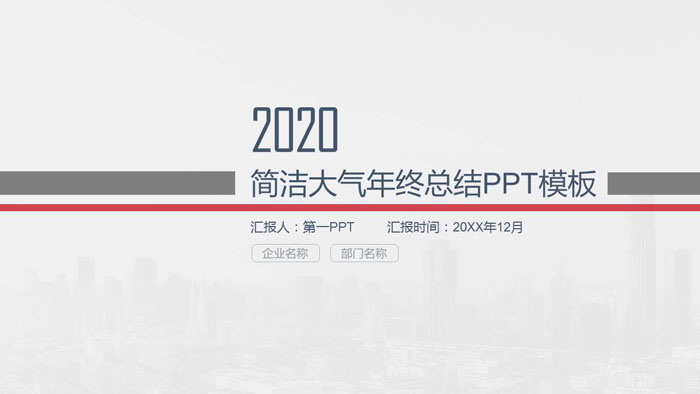幻灯片模板使用了淡雅灰色底色。PPT模板封面,中间填写工作总结年份,以及销售工作总结PPT标题文字。下方使用了灰色线条与红色线条装饰。界面设计非常简洁。