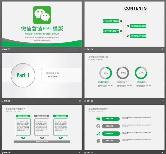 这是一套绿灰配色的,微信营销PPT模板。共23张;