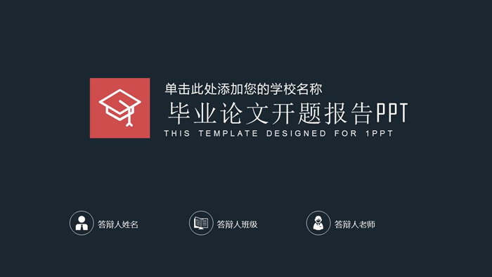 PPT模板封面,使用了深蓝灰色底色。左侧放置红色博士帽图标,右侧填写 毕业论文开题报告PPT标题文字。下方填写答辩人、班级、导师等信息。界面非常简洁。