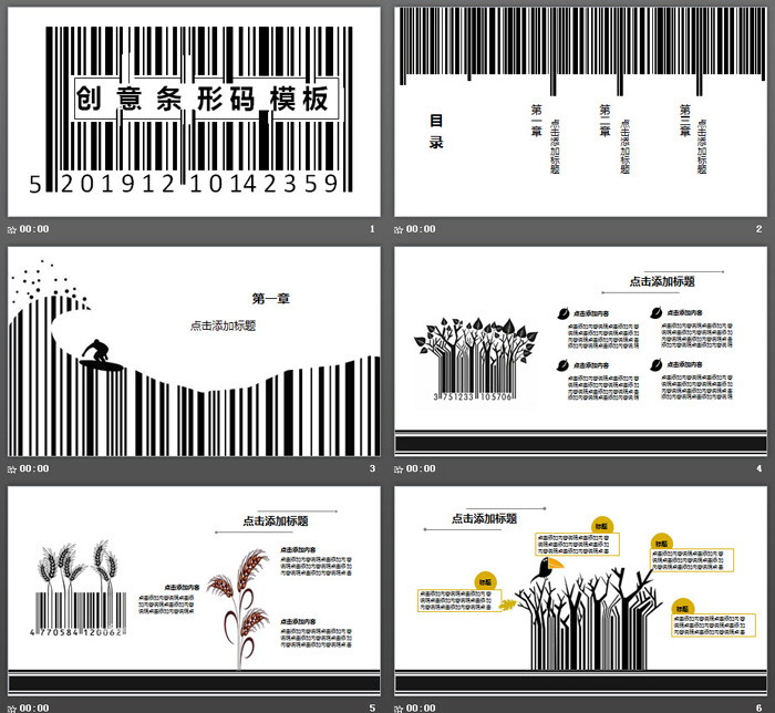 PPT模板以条形码为设计主题制作。PPT模板封面,放置了黑白条形码图案,中间填写PPT标题文字。