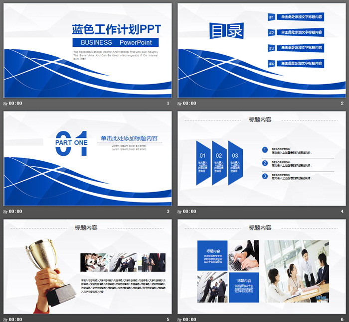 PowerPoint模板内容页,由25张蓝色动态幻灯片图表制作。另外使用了多张,职场人物、商业建筑、工作场景等图片排版。