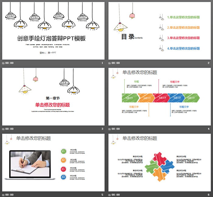 关键词:创意手绘艺术PPT模板,灯泡、点灯幻灯片背景图片,动态毕业答辩PPT模板免费下载,.PPTX格式;