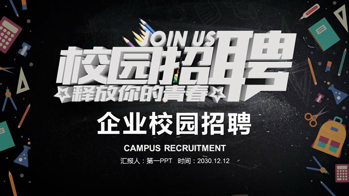 PPT模板使用了黑色背景,彩色文具类图标背景图。首页中间放置3D立体艺术字“joinUS,释放你的青春——校园招聘”PPT标题文字。界面充满青春活力,与校园招聘PPT主题搭配。