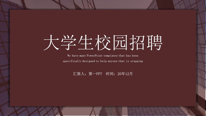 PPT模板封面,使用了商业建筑PPT背景图片。中间放置红色带有阴影效果的矩形文本框,填写大学生校园招聘PPT标题文字。界面简洁实用。