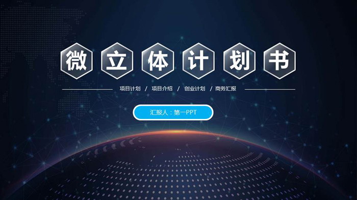 PPT模板使用了蓝色星空星球PPT背景图。首页中间放置白色半透明六边形,填写网络科技公司商业融资计划书PPT标题文字。界面简洁大气,与科技PPT主题搭配。