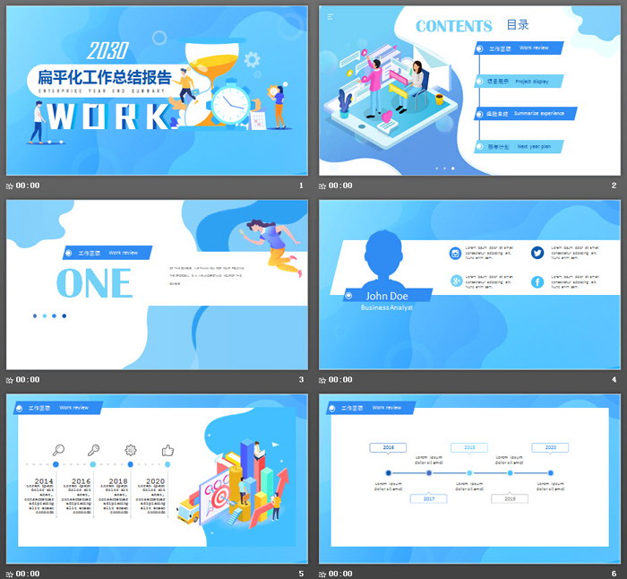 PPT模板使用了蓝色曲线图案PPT背景图。首页放置了扁平化的职场人物、沙漏、时钟等图案。左侧填写工作总结报告PPT标题文字。界面简洁商务。