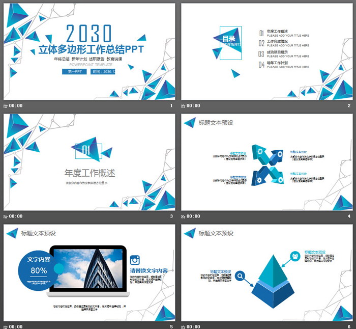 关键词:蓝色立体三角形、多边形PPT模板,动态工作总结汇报PPT模板免费下载,.PPTX格式;