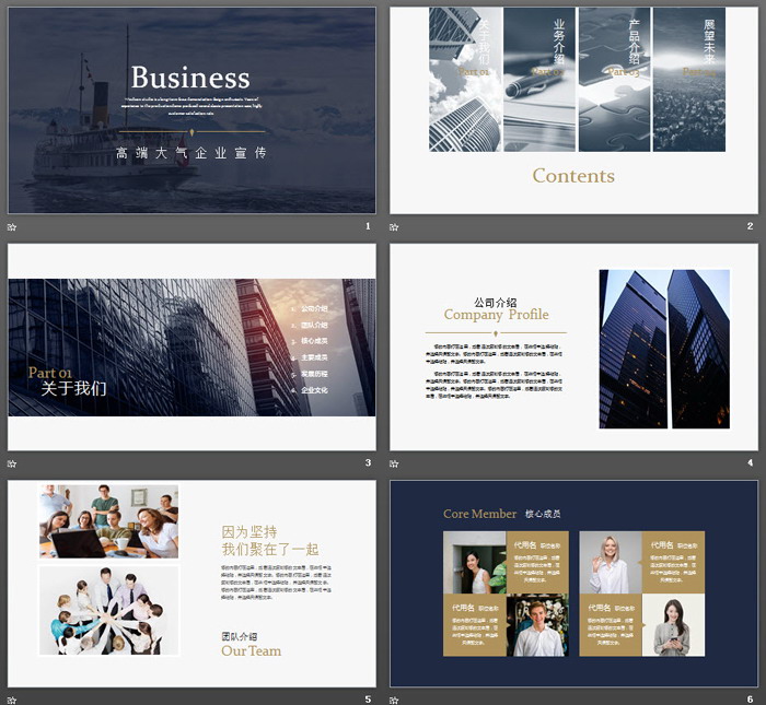 PowerPoint模板内容页,由29张金色与淡雅灰色搭配的动态PPT图表制作。另外使用了摄影插图、商业建筑插图、自然风景插图、商务办公插图等排版。