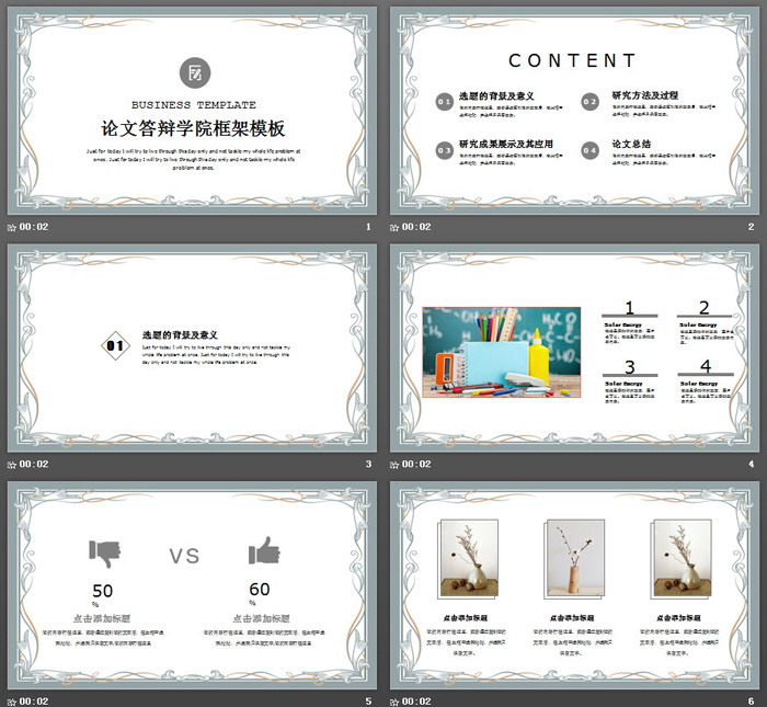 PPT模板使用了素雅灰色的古典欧式花纹PPT边框背景图。首页中间填写毕业论文开题报告PPT标题文字,以及毕业答辩人等信息。