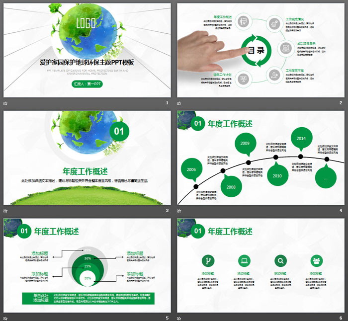 这是一套绿色地球背景的,环境保护PPT模板,共25张;