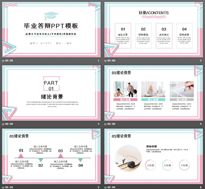PowerPoint模板内容页,由25张清新蓝粉配色的PPT图表,搭配毕业答辩PPT文案排版制作。另外使用了书籍PPT插图、文件PPT插图、学习桌PPT插图等与学习有关的插图排版。