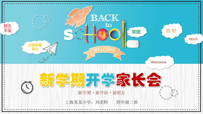PPT模板封面,使用了卡通火箭、苹果、文具构成的school等PPT背景元素,周围使用白云图案填写美好的欢迎词语。中间填写小学新学期家长会PPT标题文字,班级、老师信息等。界面卡通可爱。