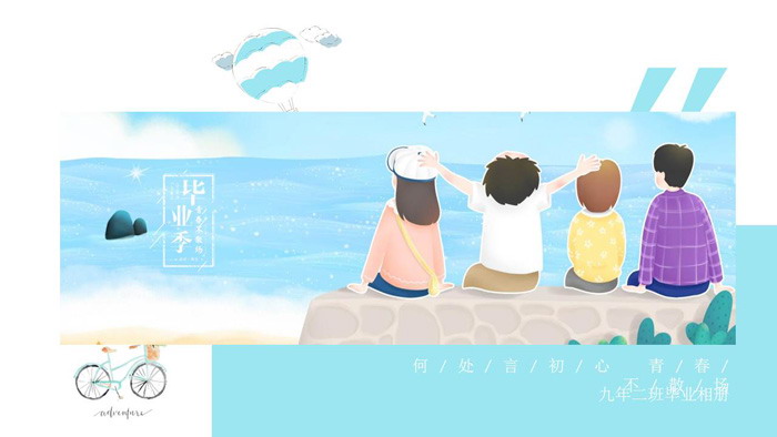 PPT模板封面,使用了水彩绘制的4位同学坐在海边,回忆过去,畅谈未来。左侧填写毕业季PPT标题文字。界面卡通清新。