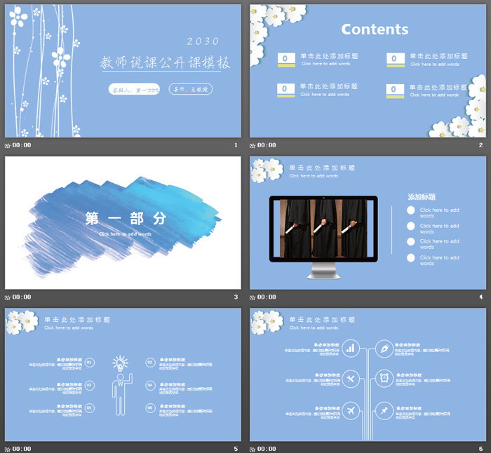 PPT模板使用了浅蓝色背景色。首页放置白色小花PPT背景图片。右侧使用手写字体填写 教师公开课PPT标题文字。界面简洁雅致。