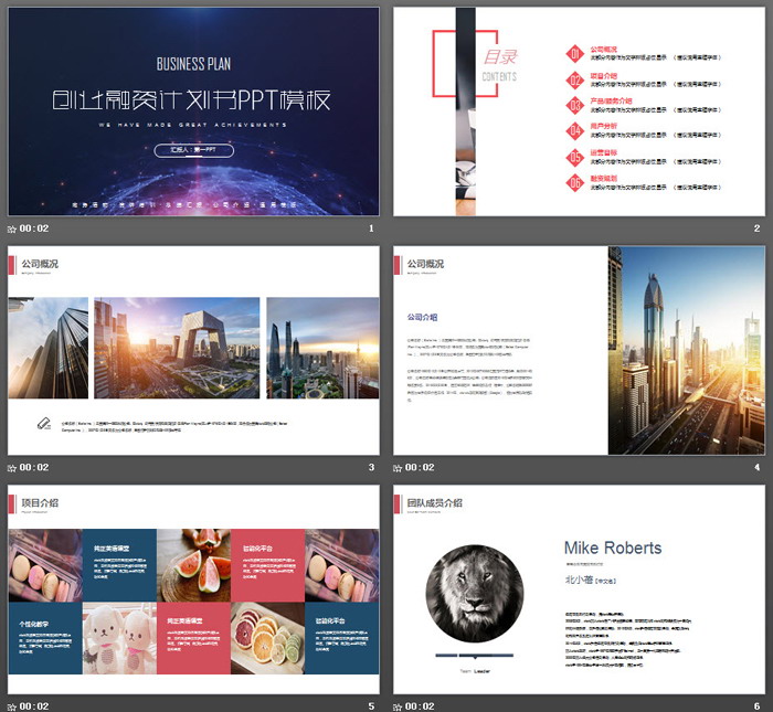 PowerPoint模板内容页,由24张蓝色红色搭配的扁平化幻灯片图表,搭配创业融资计划书文案排版。另外使用了发达城市建筑PPT插图、商务办公场景PPT插图等装饰。