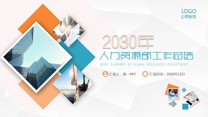 PPT模板封面,使用了蓝色橙色方块与商业建筑、帆船等图片叠加组合。右侧填写人力资源部工作总结PPT标题。界面简洁商务。