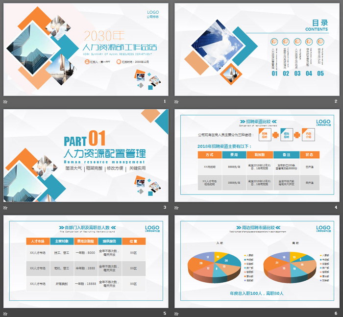这是一套彩色方形组合背景人力资源部工作总结PPT模板,共31张;